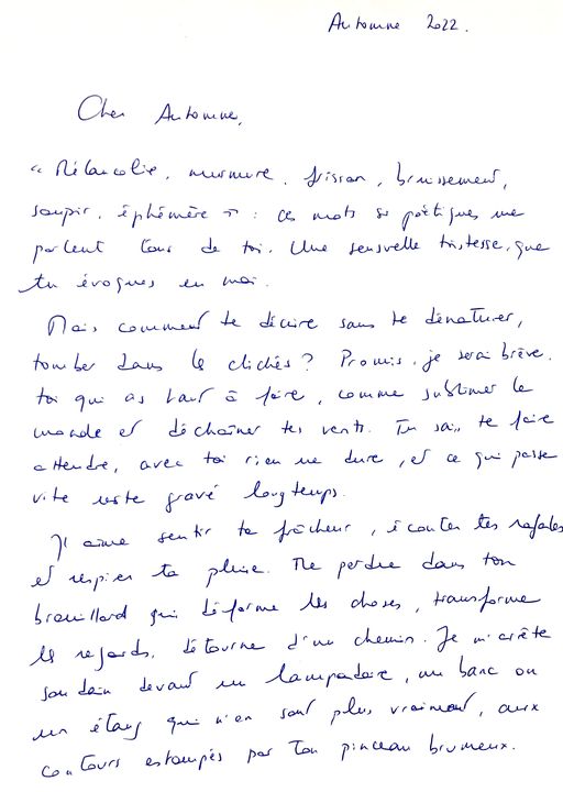 J'écris une vraie lettre (et non pas un texto, WhatsApp ou Messenger) à ma saison préférée.